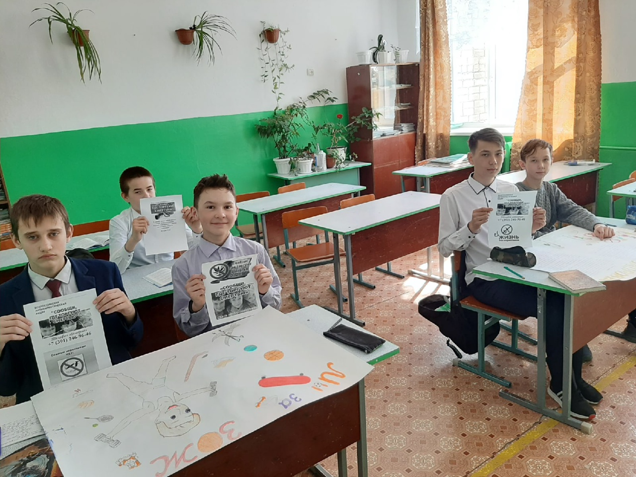 В период антинаркотической акции "Сообщи, где торгуют смертью" в школе проведён цикл мероприятий (лекции, беседы, классные часы), в которых приняли участие учащиеся. Оформлен стенд "Мы выбираем жизнь! ", распространены памятки, буклеты по пропаганде ЗОЖ, просмотр социальных роликов по профилактике наркомании. Среди учащихся проведена разъяснительная работа о необходимости предоставления информации по «телефонам доверия», показан фильм о последствиях употребления наркотических средств.