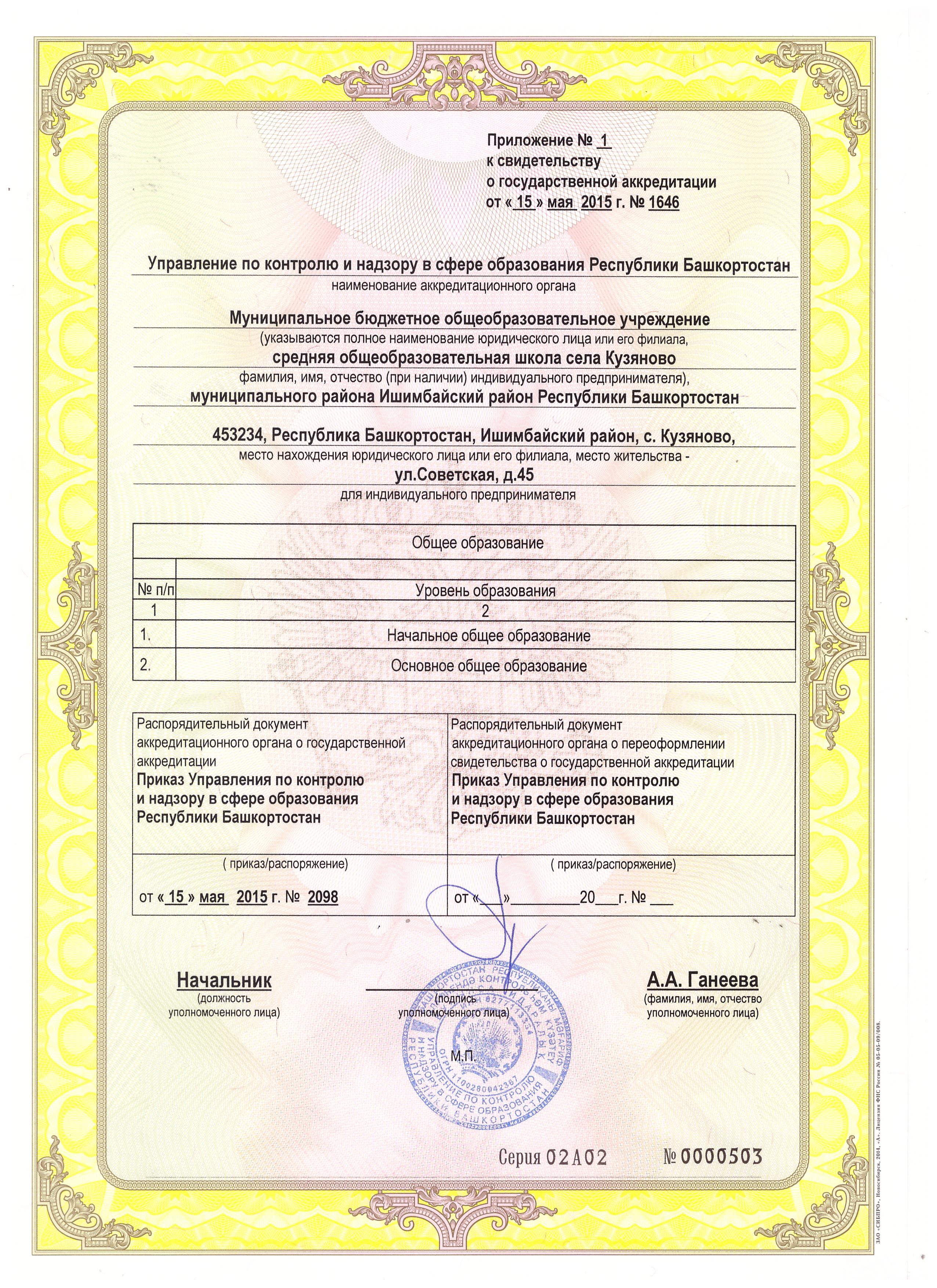 | Адрес места нахождения образовательной организации | 453234, Республика Башкортостан,Ишимбайский район, с. Кузяново,ул.Советская, д.45 |